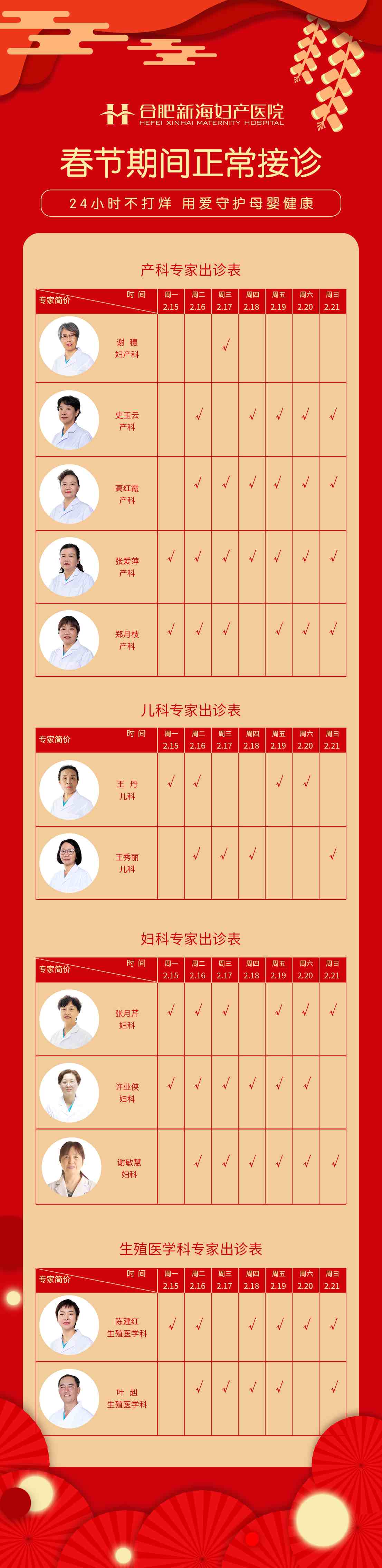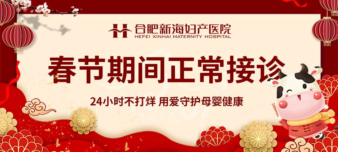 为了方便孕妈妈及家属春节期间正常就诊,合肥新海妇产医院春节期间不放假、照常接诊,各位医务人员仍坚守岗位,继续以精湛的医疗技术、细致入微的态度,为您提供更贴心、更优质、更高效的医疗服务!